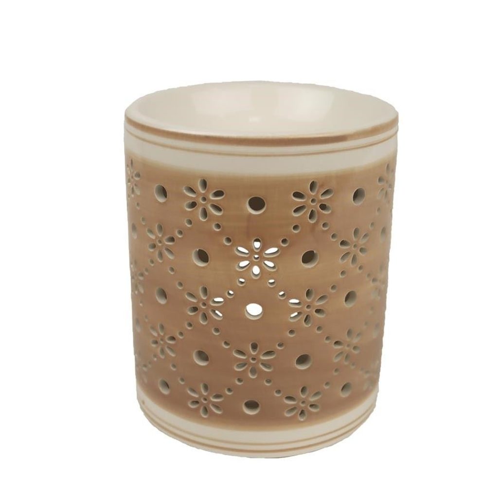 Keramická aromalampa. Aromalampa je výborná pro odpařování éterických olejů rozpuštěných ve vodě či voskových aromakapslí. Aromalampa poslouží nejenom jako difuzér pro osvěžení vzduchu, ale také je pěknou vkusnou dekorací do každého interiéru. Rozměry : průměr 12 cm, výška 14,5 cm. Barva : kombinace bílá s hnědou. Materiál : keramika.
