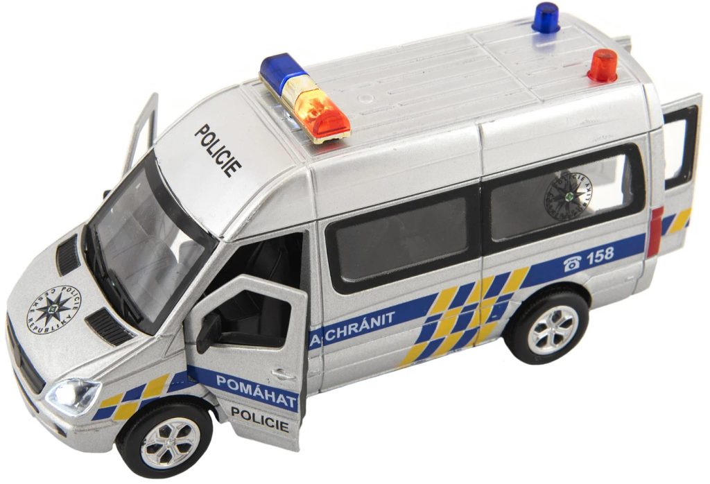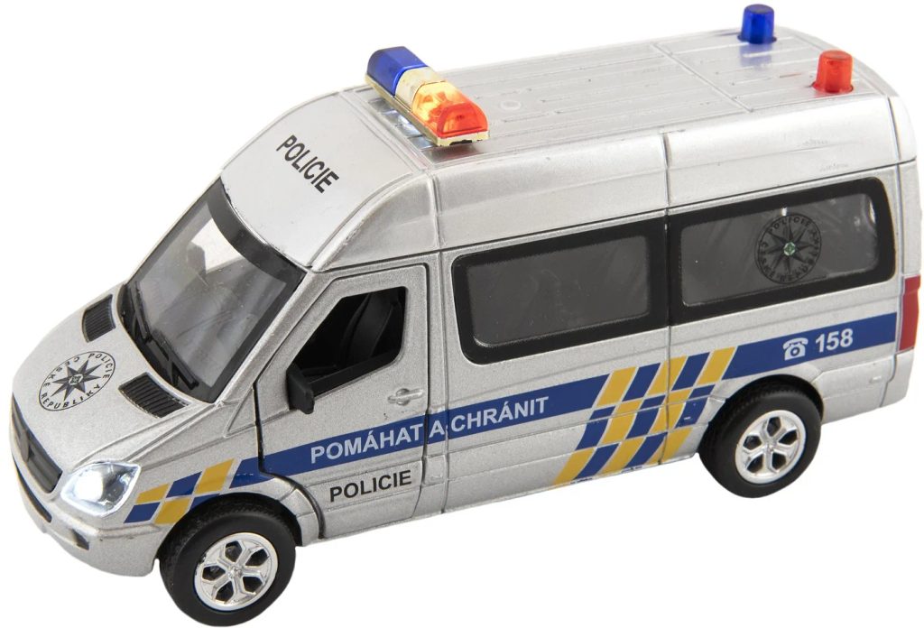 Kovové autíčko pro malé policisty je vyrobeno s plastovými doplňky. Malý model jezdí na zpětné natažení, má otevírací přední a zadní dvěře, vydává zvuky startování a houkačky, má efekty blikajících světel.