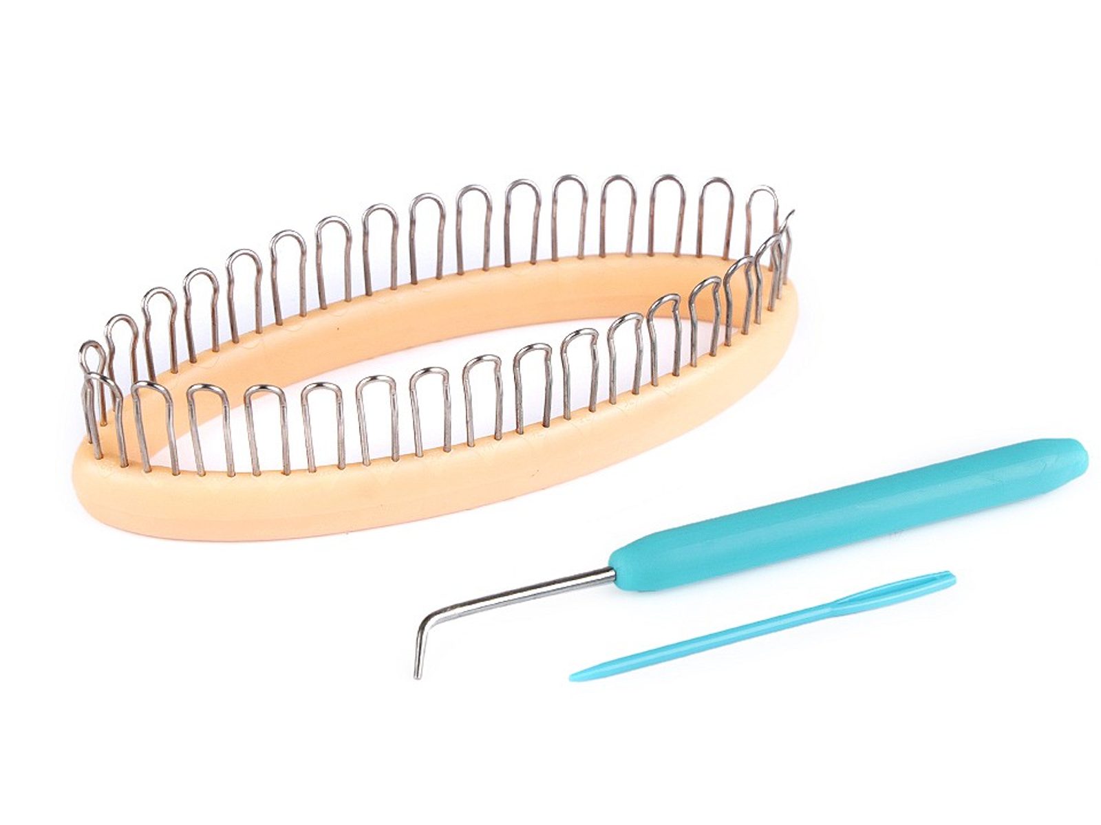 Balení obsahuje nástroj na pletení, kovový háček pro snadné snímání ok a plastovou jehlu k zapošití příze. Součástí balení je i podrobný návod v češtině. Na rámečku je 32 hrotů.