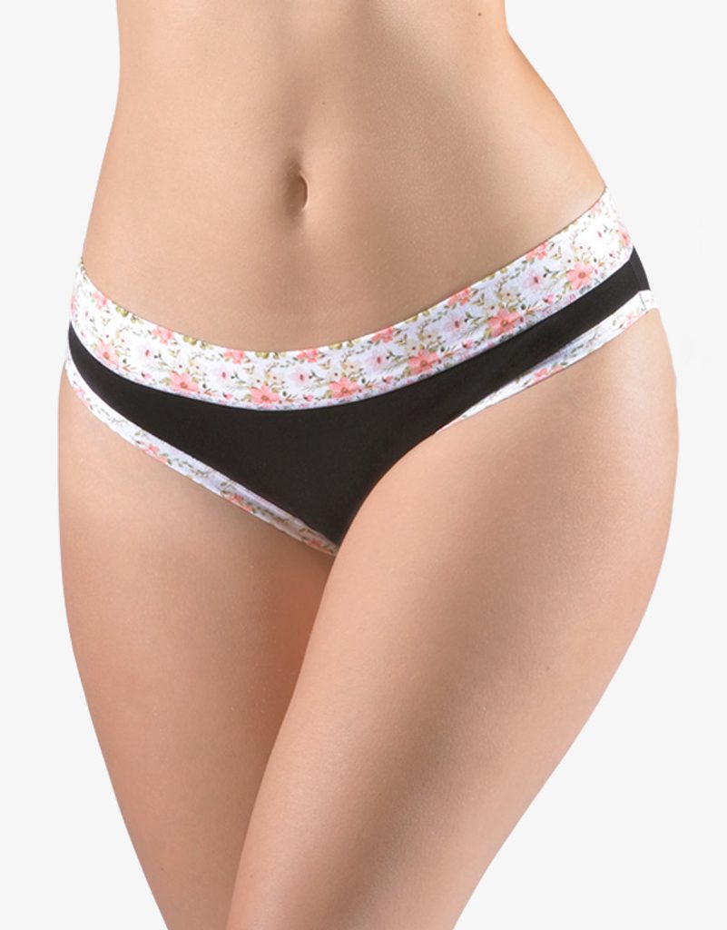 Bokové kalhotky se širším bokem, bokovky, a se širším pasovým lemem, dámské šité prádlo. Pasový kraj je začištěný širším lemem ze stejného materiálu. Nohavičky jsou začištěné úzkým lemem ze stejného materiálu. Potisk s kytičkami zdobí pasový lem a lem na nohavičkách.