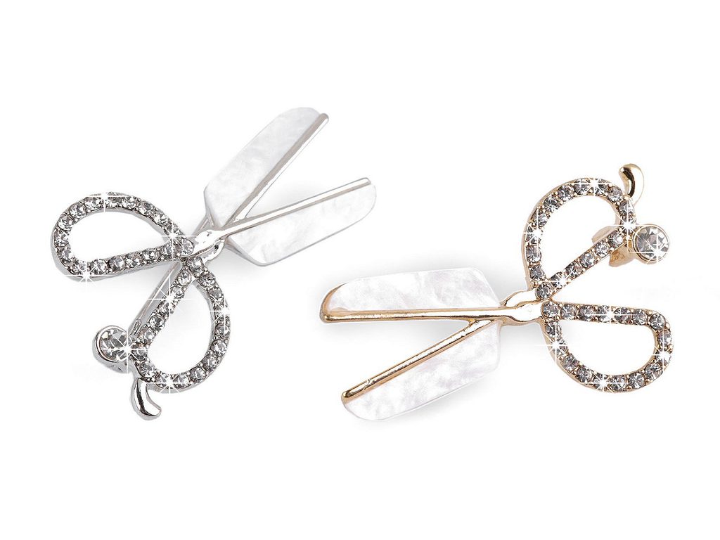 Brož elegantních nůžek bude skvělým dárkem nejen pro švadlenku nebo kadeřnici. Je osázená třpytivými, broušenými kamínky, nožky jsou ozdobené imitací perleti. Ze zadní strany má zavírací špendlík. Efektně působí nejen na oděvech, ale je vhodná i k ozdobení klobouků, tašky či sepnutí šátku.