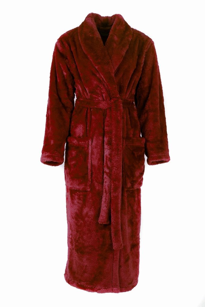 Extra huňatý župan od české značky Vestis. Dámský dlouhý župan v nestárnoucí vínové barvě. Župan pro ženy se šálovým límcem, zavazováním v pase a velkými kapsami.