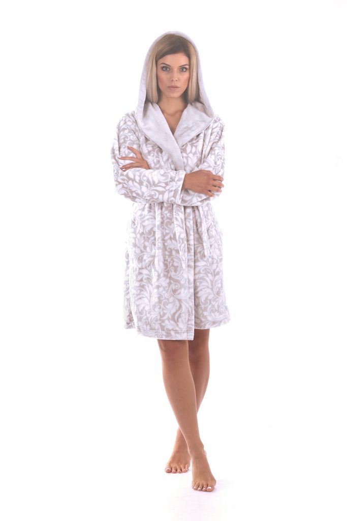 Elegantní a romantický župan s kapucí pro všechny ženy v krátké délce. Krátký župan Flora od českého výrobce Vestis. Župan ve světle šedé barvě v kombinaci s elegantní bílou barvou.