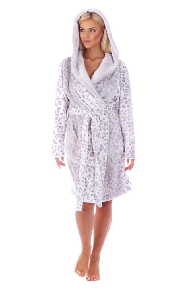 Krátký dámský župan s kapucí Irbis od českého výrobce županů Vestis. Župan v moderním a velmi oblíbeném levhartím vzoru v kombinaci se světle šedou.