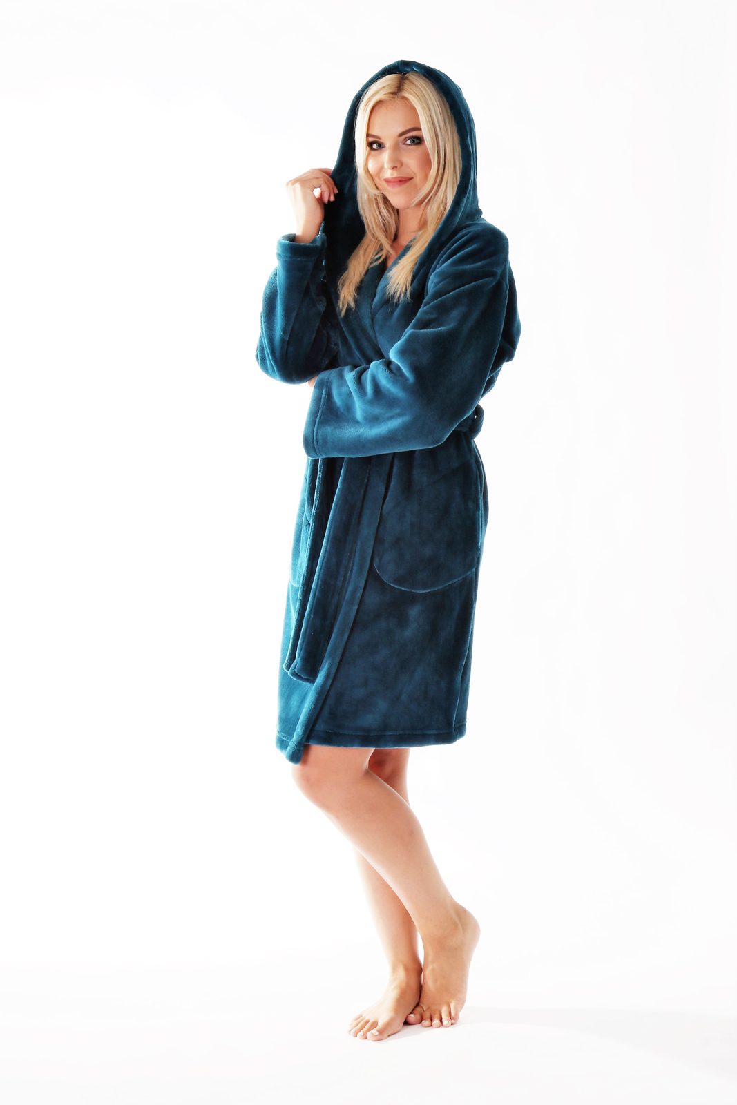 Pohodlný dámský župan v petrolejové barvě o délce 100 cm v univerzální velikosti S/M nebo L/XL. Krátký župan Siena s kapucí, kapsami a zavazováním v pase. Ideální na domácí lenošení, zahřeje Vás v sychravém počasí.