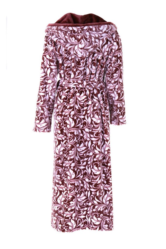 Vzorovaný župan v tmavě vínové barvě s bílým květinovým vzorem