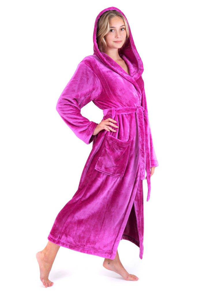 Dámský župan s kapucí Siena v oblíbené a moderní fialové - fuchsiové barvě. Dlouhý župan s kapucí, zavazováním v pase a kapsami.