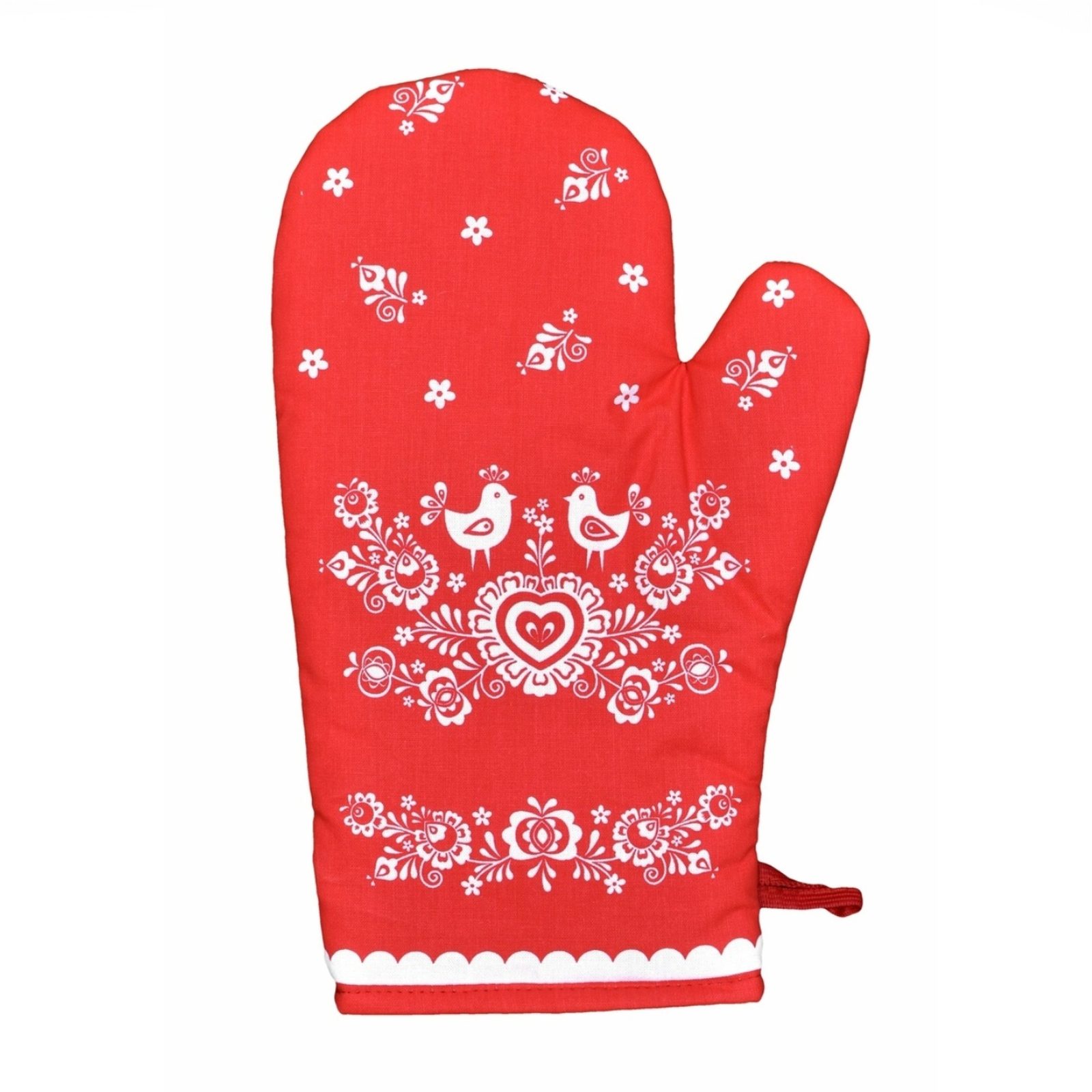 Kuchyňská chňapka s krásným slováckým motivem laděná do červené a bílé barvy. Vzor Folk červený podklad. Skvělý tip na dárek. Ve stejném vzoru najdete v nabídce i zástěru.