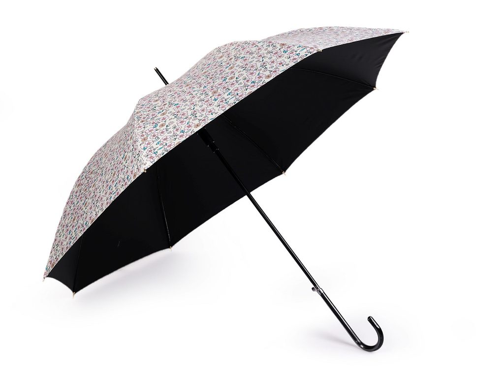 Velký dámský deštník s potiskem květů je vystřelovací, konstrukci má z kovového drátu a pružných lamel, které tvoří osm polí. Díky nim je velice pevný, neohne se ani za největšího nečasu. UV filtr vás ochrání před slunečním zářením. Klasická tyč je zakončená pevnou rukojetí z eko kůže. Dolní strana potahu je černá.