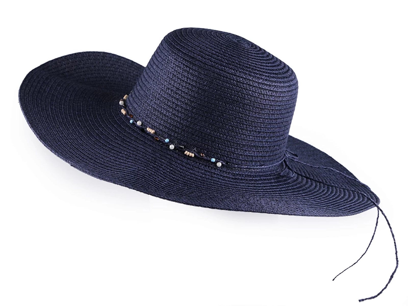 Dámský letní klobouk je stylovým i praktickým doplňkem v horkých dnech. Kolem koruny má provázek, který je doplněný korálky. Provázek je ke klobouku přilepený, nelze ho sundat.
