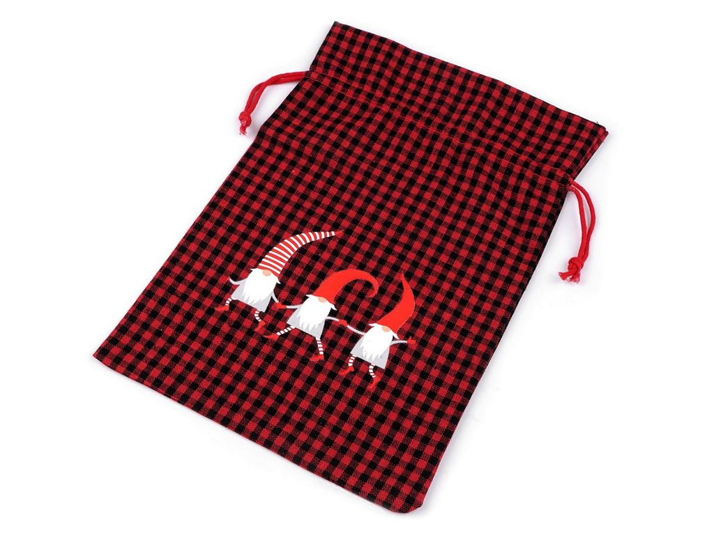 Károvaný dárkový pytlík s potiskem skřítků můžete použít na balení dárků nebo ho naplnit mikulášskou nadílkou. Dá se naaranžovat jako vánoční dekorace. Snadno se uzavírá pomocí saténových stahovacích šňůrek.