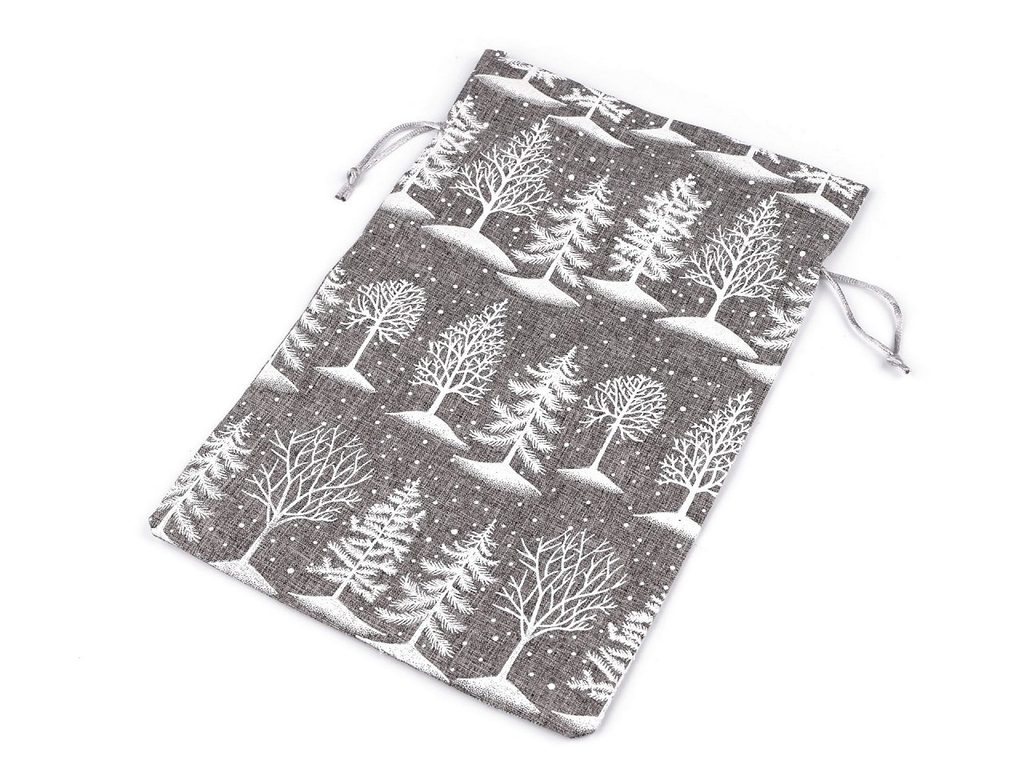 Dárkový pytlík s potiskem stromečků je místy doplněný třpytivými glitry. Skvěle se hodí na rychlé a efektní zabalení dárků. Materiál pytlíku svým zpracováním připomíná jutu. Uzavírá se pomocí stahovacích šňůrek.