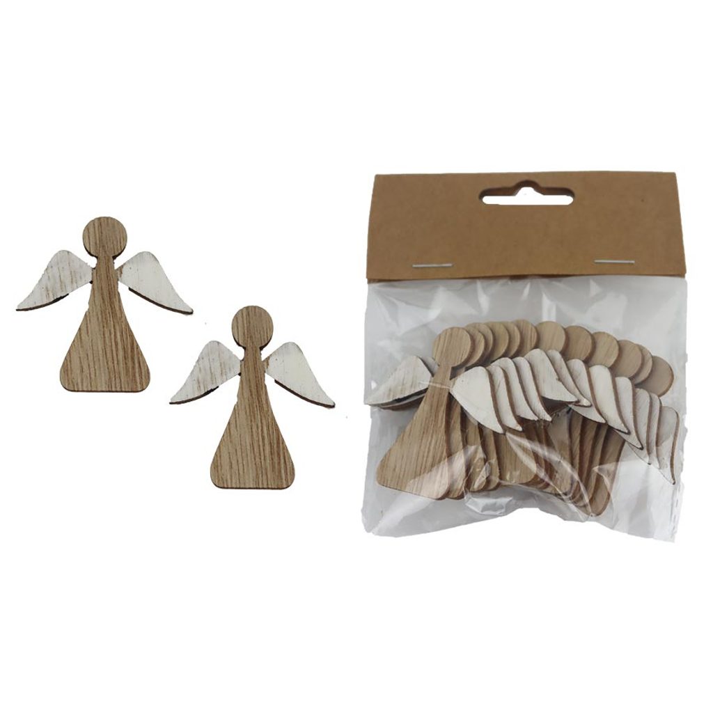 Sada dekoračních andílků. Sada obsahuje 12 andílků. Rozměry : 5 x 0,3 cm, výška 5 cm. Barva : kombinace přírodní, bílá. Materiál na bázi dřeva.
