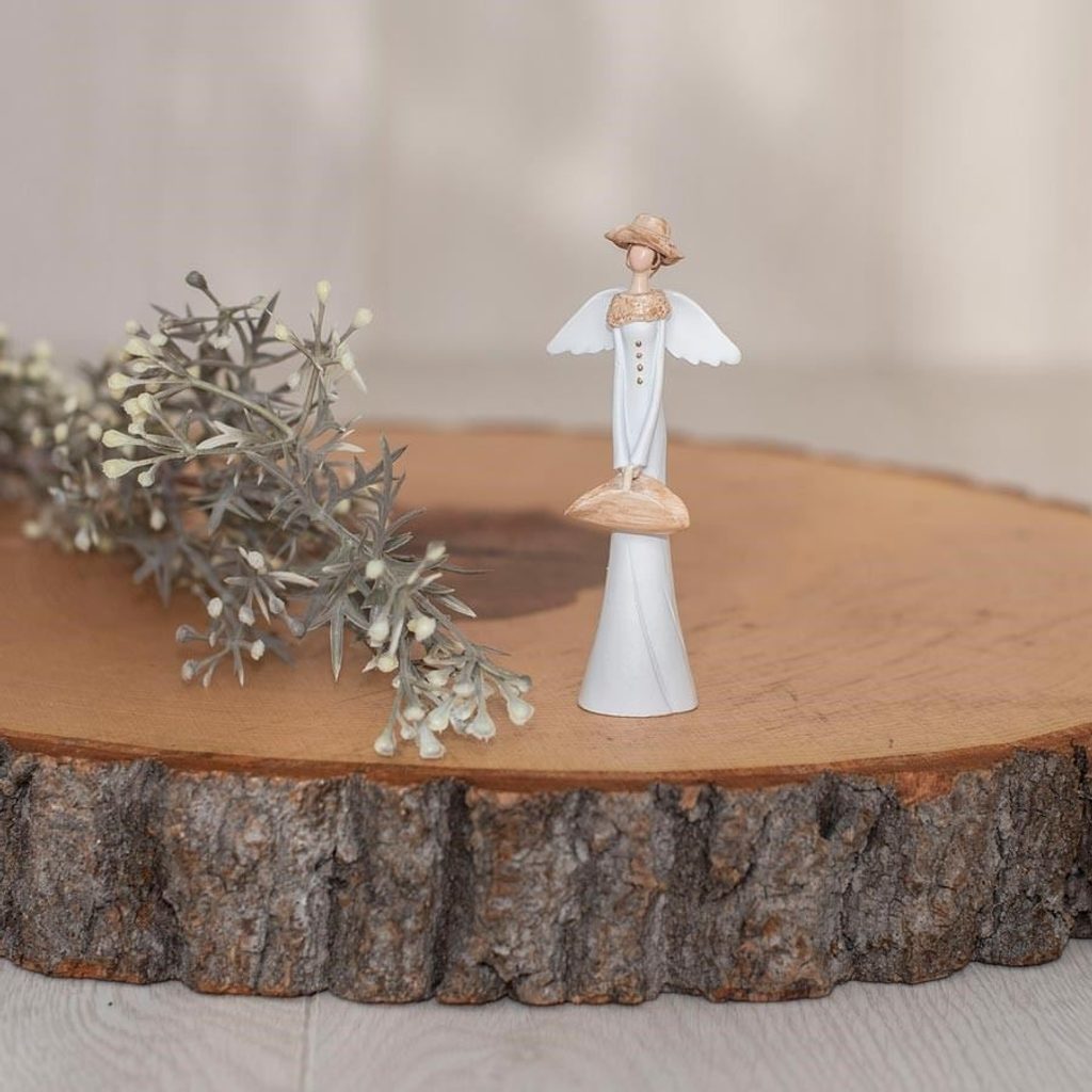 Dekorační anděl. Rozměry : 3.8 x 2.5 cm, výška 10 cm. Barva : kombinace bílá s hnědou. Materiál : polyresin.
