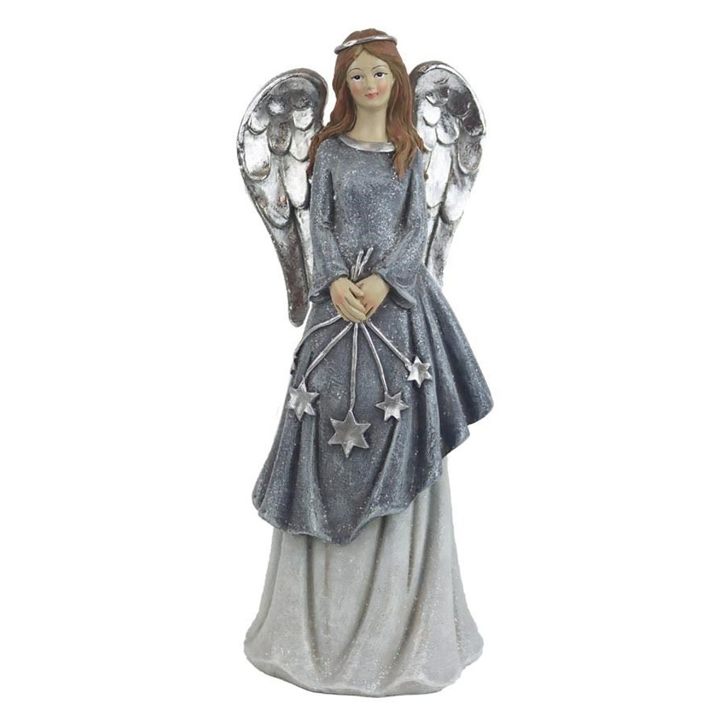 Dekorační anděl. Rozměry : 10 × 8 cm, výška 25,5 cm. Barva : kombinace šedá se stříbrnou. Materiál : polyresin.
