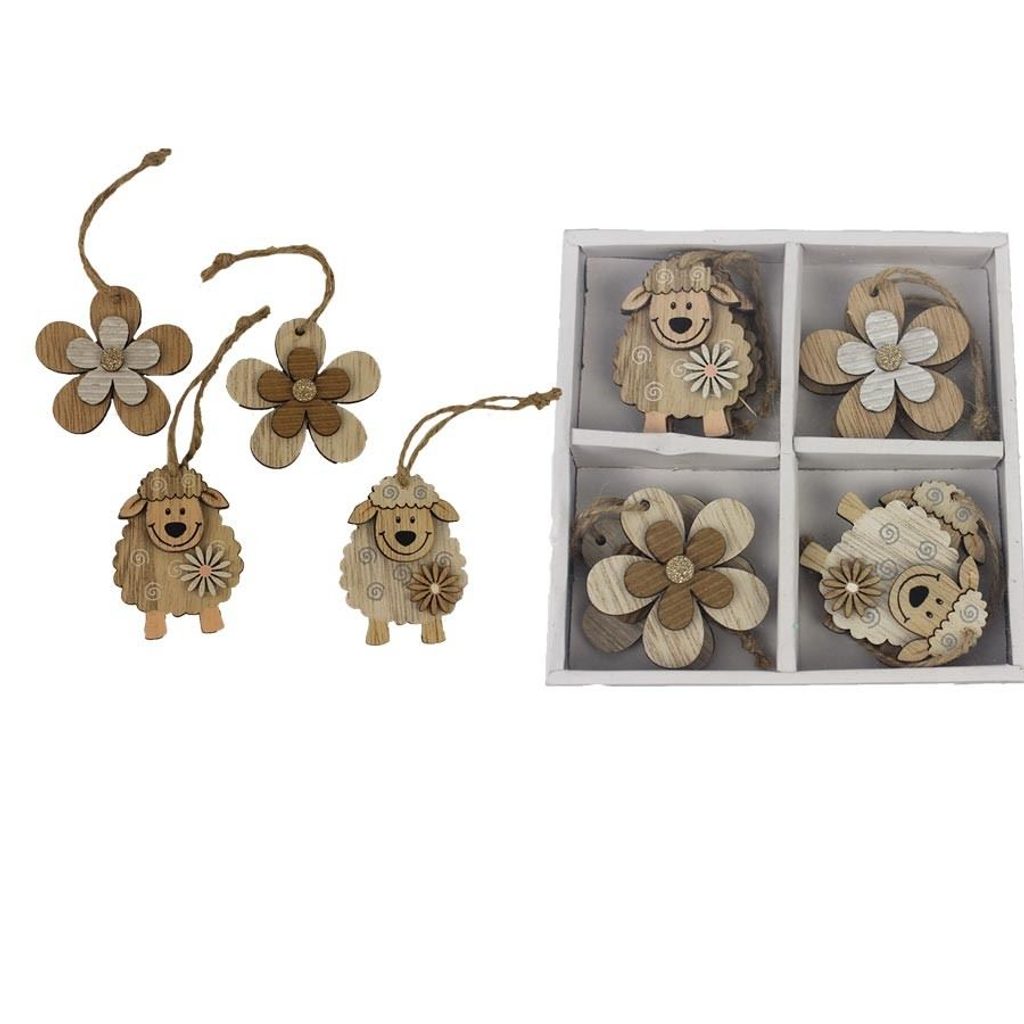 Sada jarních dekorací k zavěšení. Sada obsahuje 8 dekorací. Rozměry : 4 - 5 x 0,6 cm, výška 5,5 cm. Barva : kombinace přírodní s bílou. Materiál na bázi dřeva.