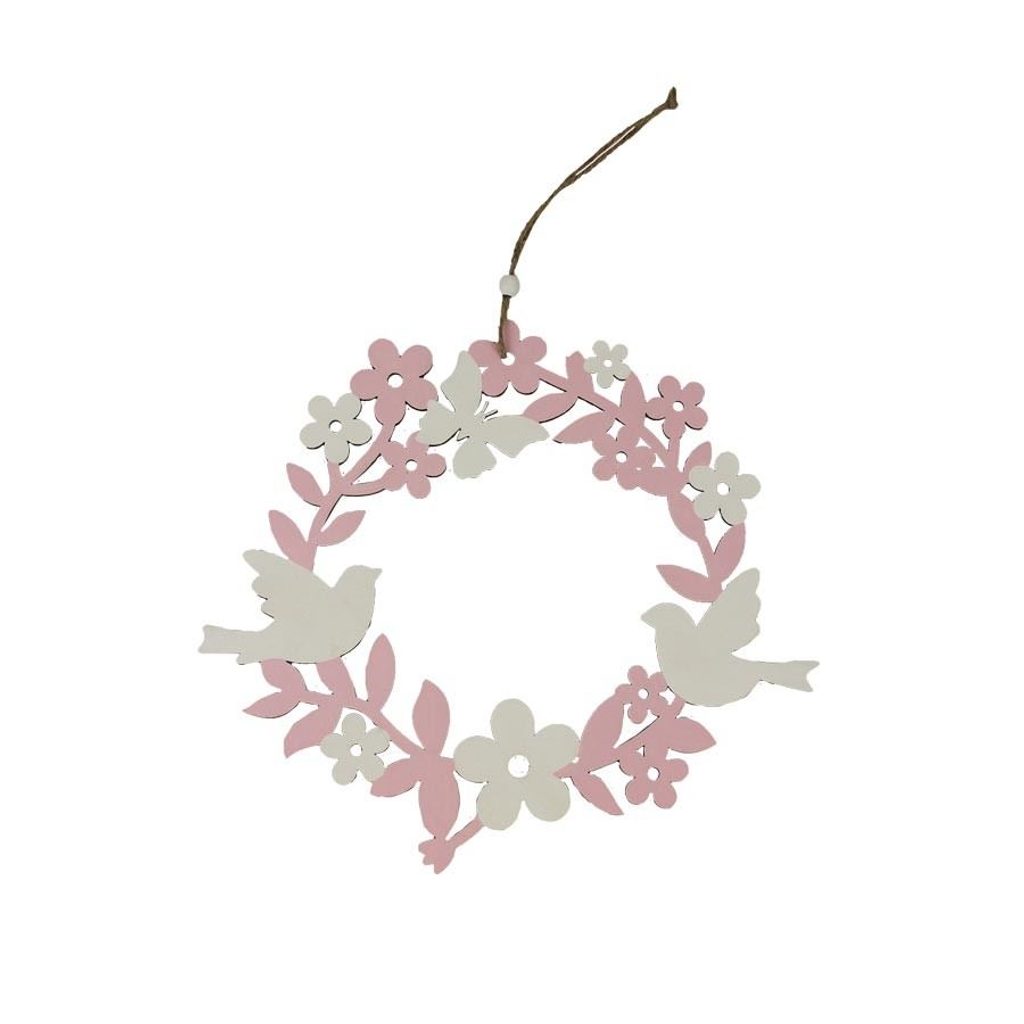 Dekorace k zavěšení. Rozměry : 25 x 22 cm, tloušťka 0,3 cm. Barva : kombinace růžová s bílou. Materiál na bázi dřeva.