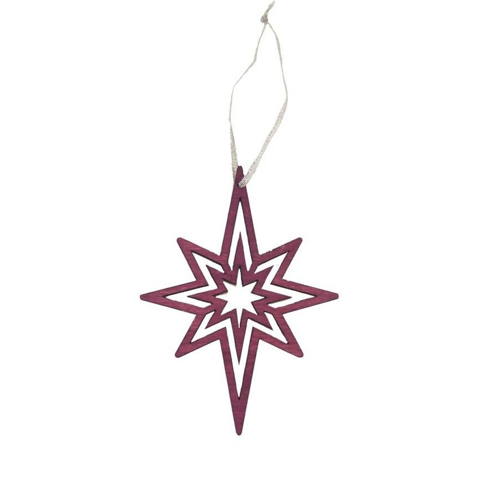 Dekorační hvězda k zavěšení. Rozměry : 9,2 x 0,7 cm, výška 12,5 cm. Barva : fialová. Materiál na bázi dřeva.