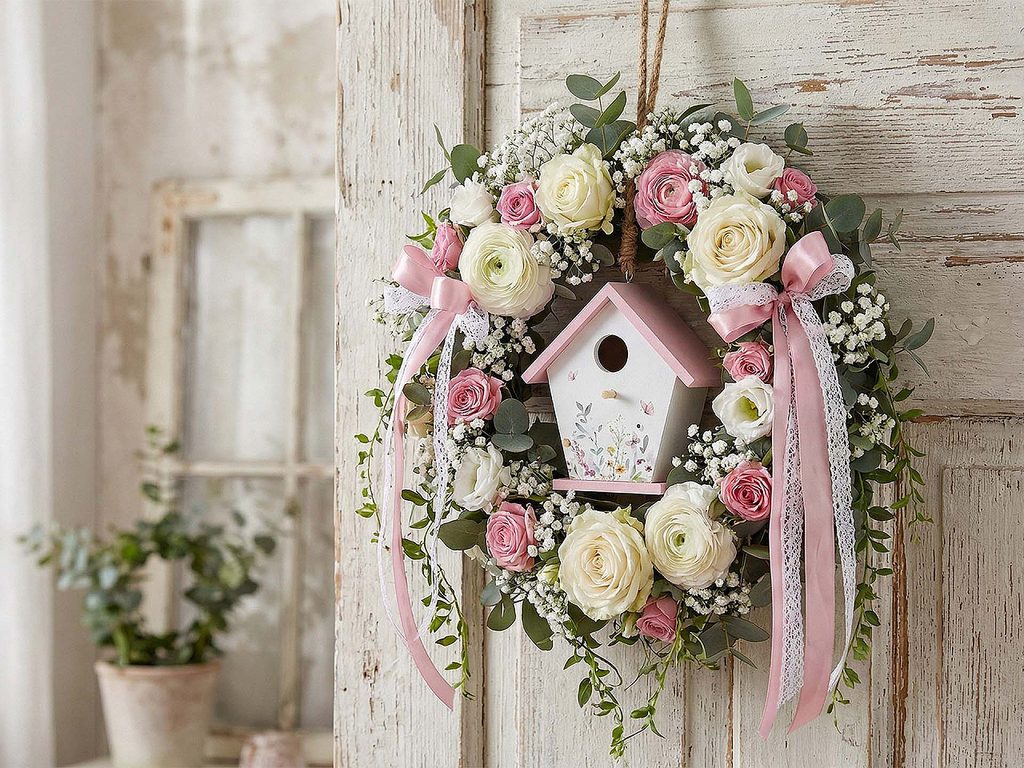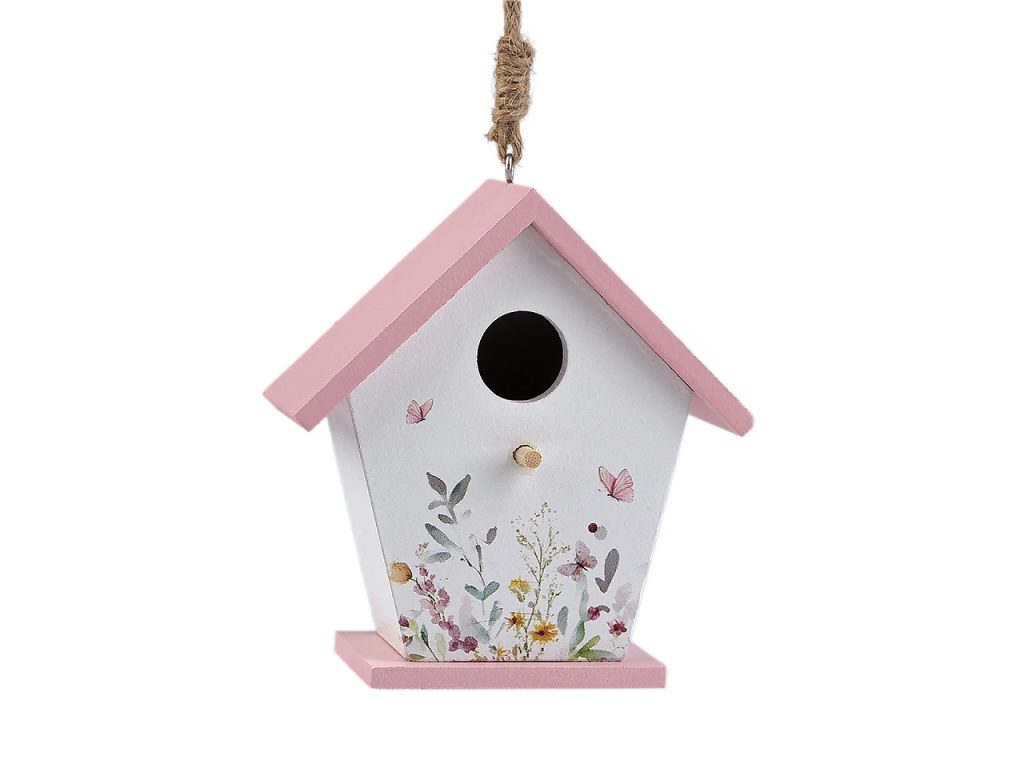 Dřevěná ptačí budka je zajímavou dekorací s romantickým vzhledem. Přední strana je ozdobená květinovým potiskem. Můžete ji umístit na terasu, balkon, do kuchyně apod. Lze ji zakomponovat i do věnce.