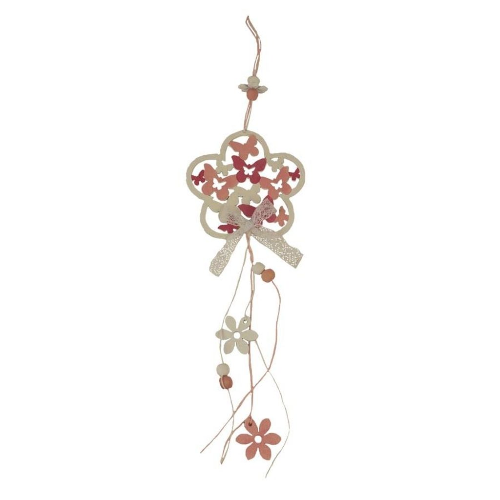 Dekorační kytka k zavěšení. Rozměry : průměr 12 cm, celková délka dekorace 50 cm. Barva : kombinace bílá s růžovou. Materiál na bázi dřeva, provázek.