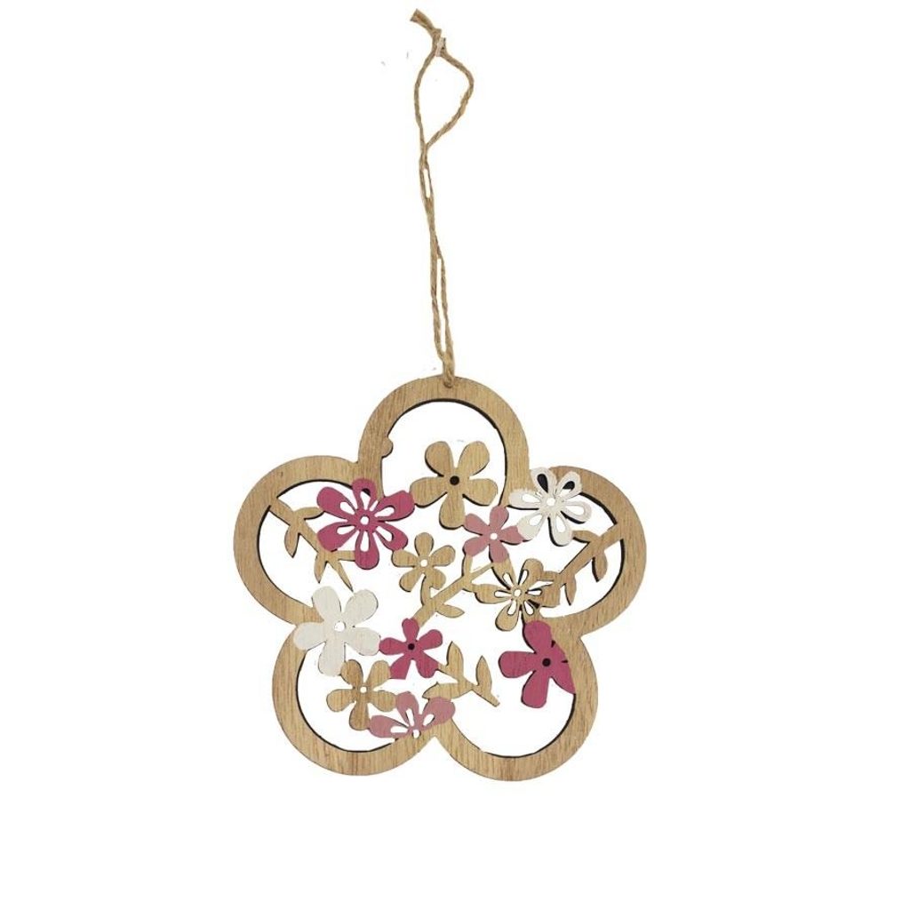 Dekorační kytka k zavěšení. Rozměry : 11,2 x 10,8 cm. Barva : kombinace přírodní, růžová, bílá. Materiál na bázi dřeva.