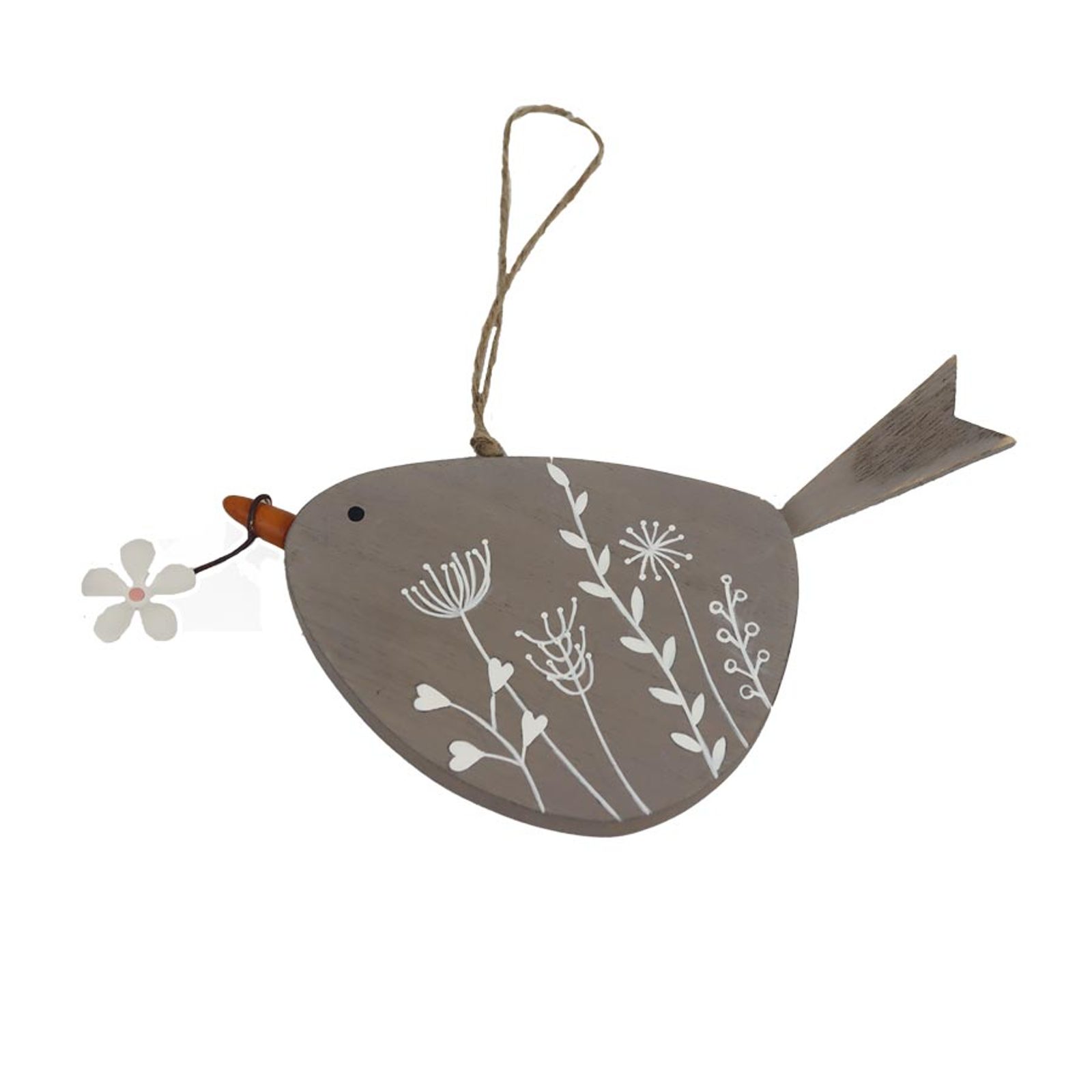 Dekorační ptáček k zavěšení. Rozměry : 10 × 1,2 cm, výška 17,5 cm. Barva : kombinace šedá s bílou. Materiál na bázi dřeva.