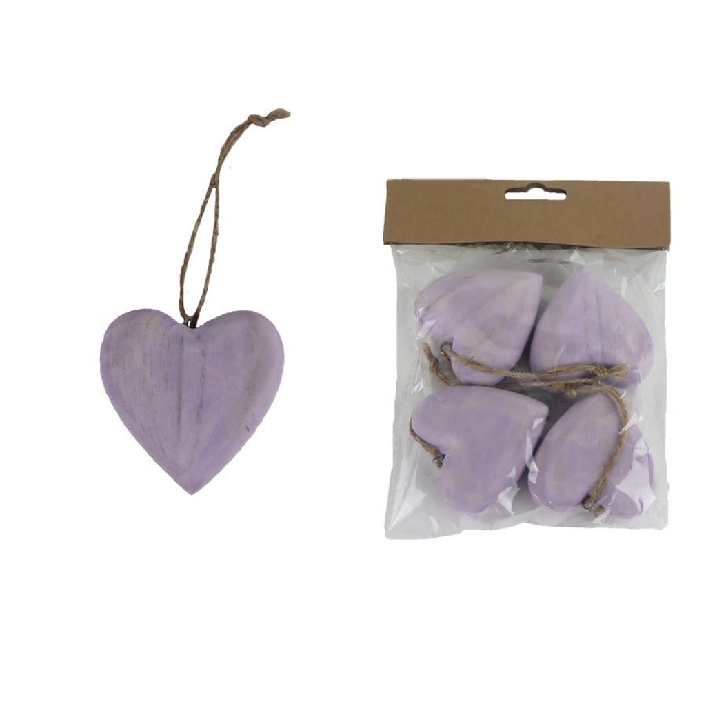 Sada srdíček k zavěšení. Sada obsahuje 4 srdíčka. Rozměry : 5,5 x 6 cm, tloušťka 2,5 cm. Barva : fialová. Materiál na bázi dřeva.