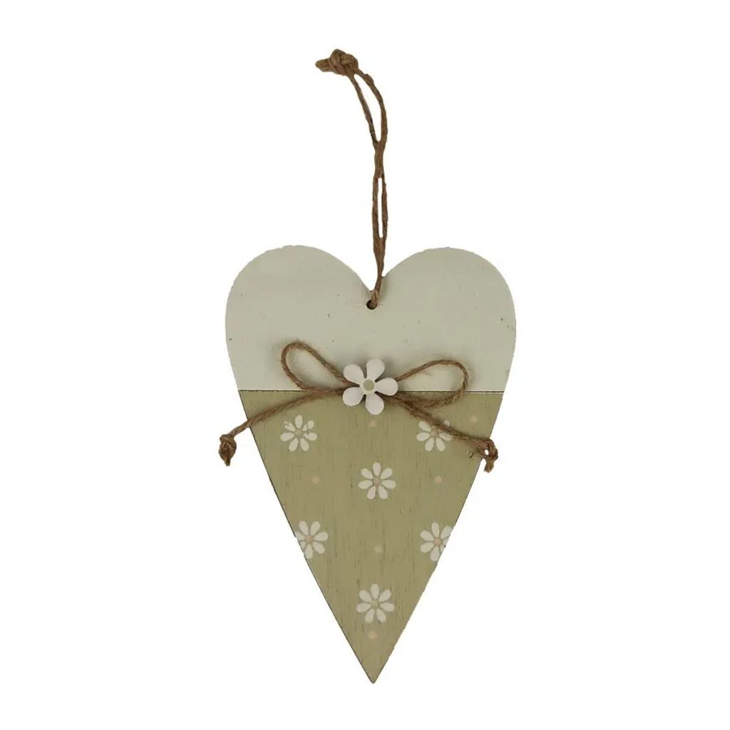 Dekorační srdce k zavěšení. Rozměry : 10 x 15 cm, tloušťka 0,5 cm. Barva : kombinace zelená s bílou. Materiál na bázi dřeva.