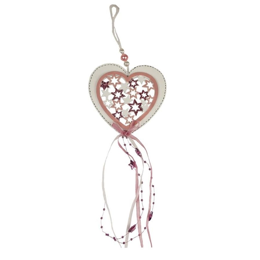 Dekorační srdce k zavěšení. Rozměry : 12 x 12 cm. tloušťka 0,4 cm, celková délka 45 cm. Barva : kombinace bílá s růžovou. Materiál na bázi dřeva.