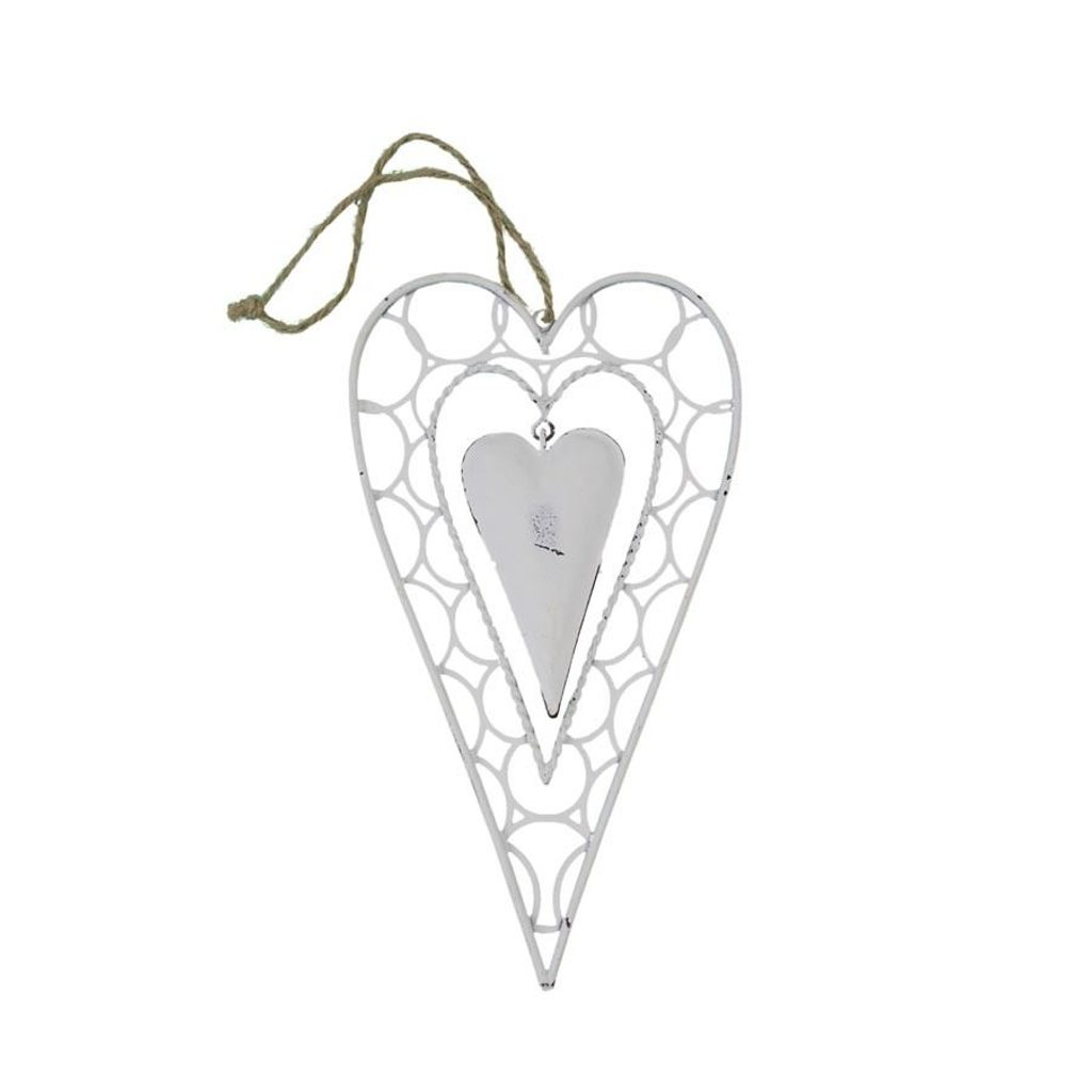 Dekorační srdce k zavěšení. Rozměry : 8 x 14,5 cm, tloušťka 0,8 cm. Barva : bílá. Materiál : kov.
