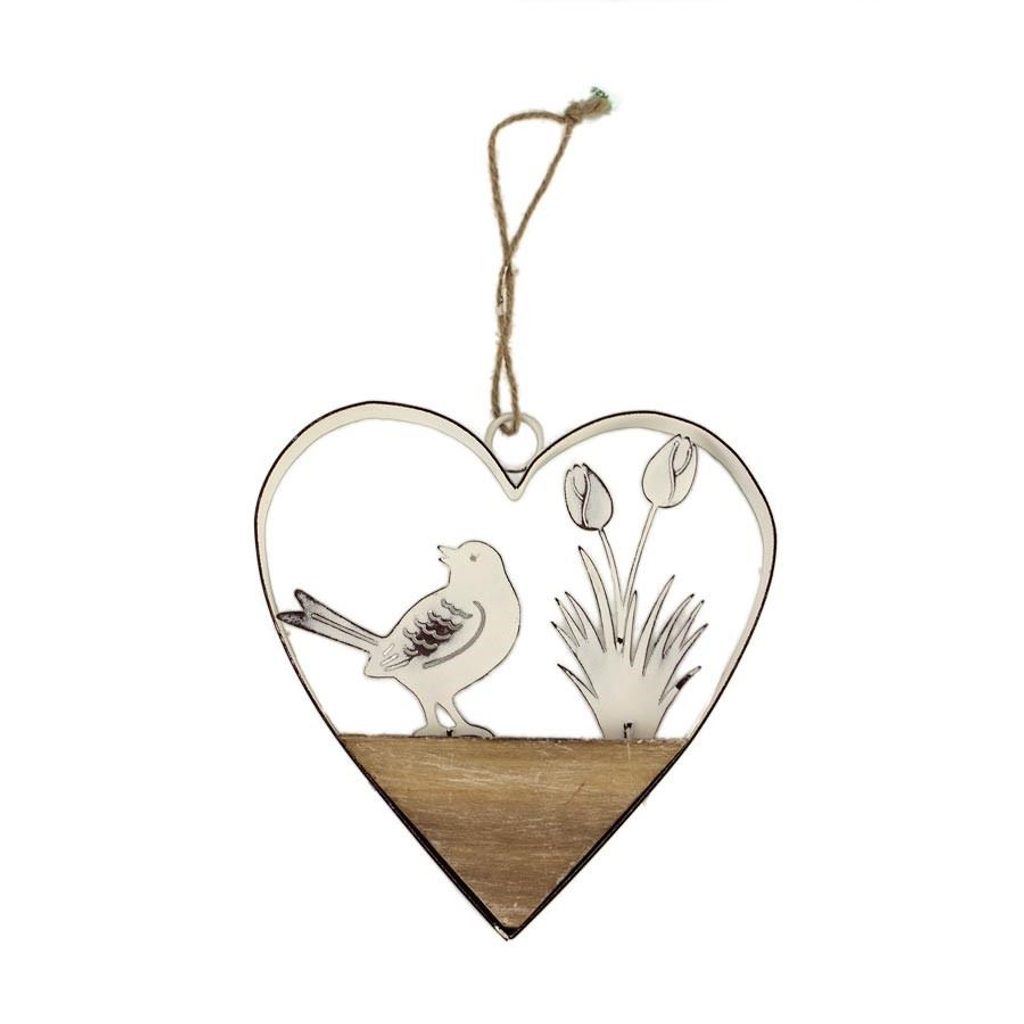 Dekorační srdce k zavěšení. Rozměry : 14,5 x 15 cm, tloušťka 1,5 cm. Barva : kombinace bílá s přírodní. Materiál, kov, dřevo.