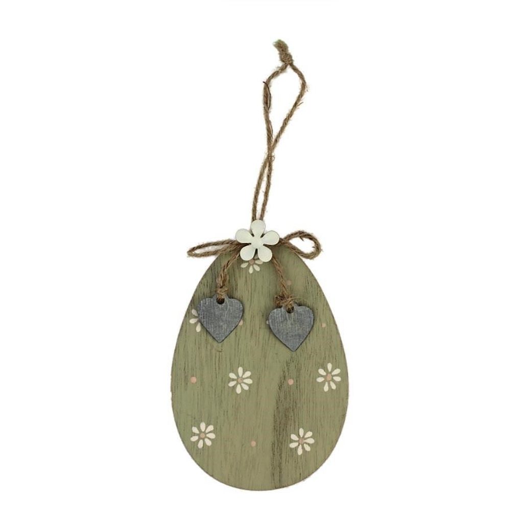 Dekorační vajíčko k zavěšení. Rozměry : 7,8 x 0,5 cm, výška 11,8 cm. Barva : kombinace zelená s bílou. Materiál na bázi dřeva.