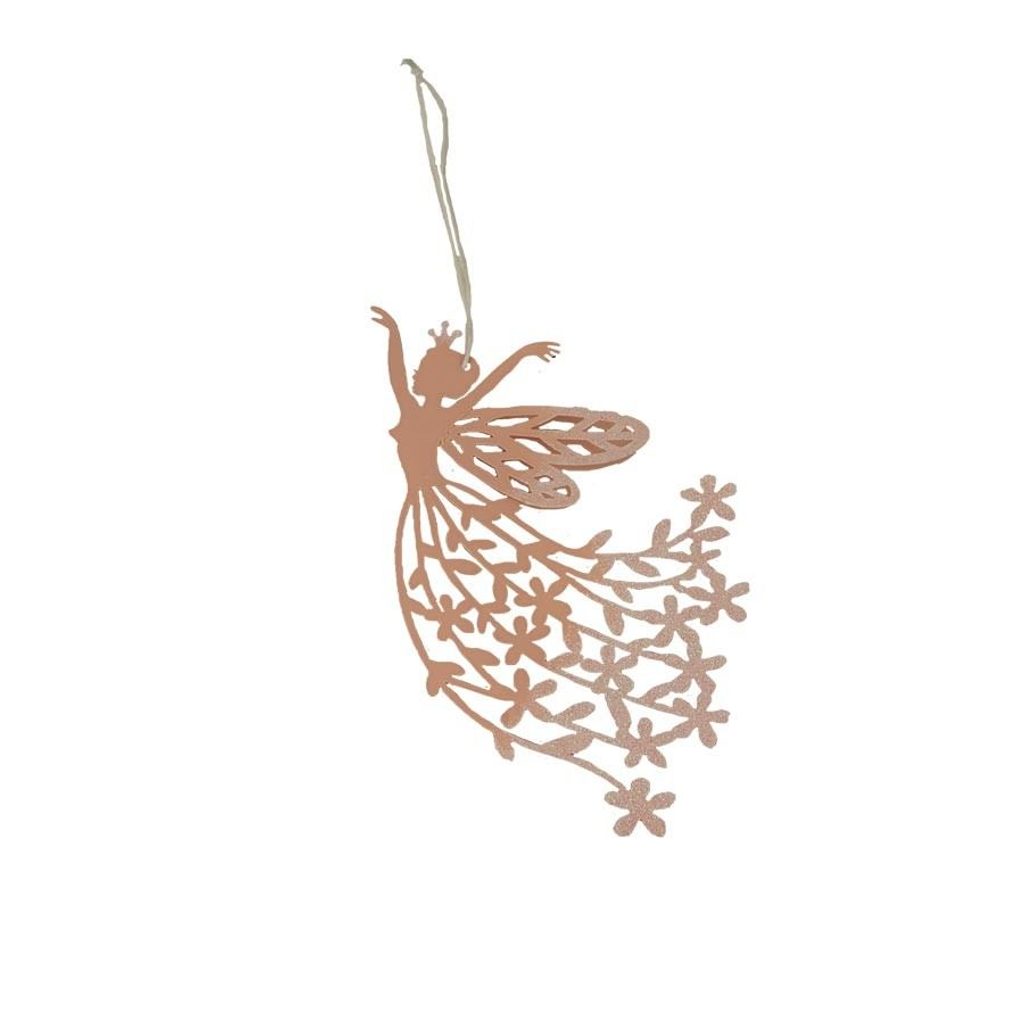 Dekorační víla k zavěšení. Rozměry : 8 x 15 cm, tloušťka 2,5 cm. Barva : růžová. Materiál : kov.