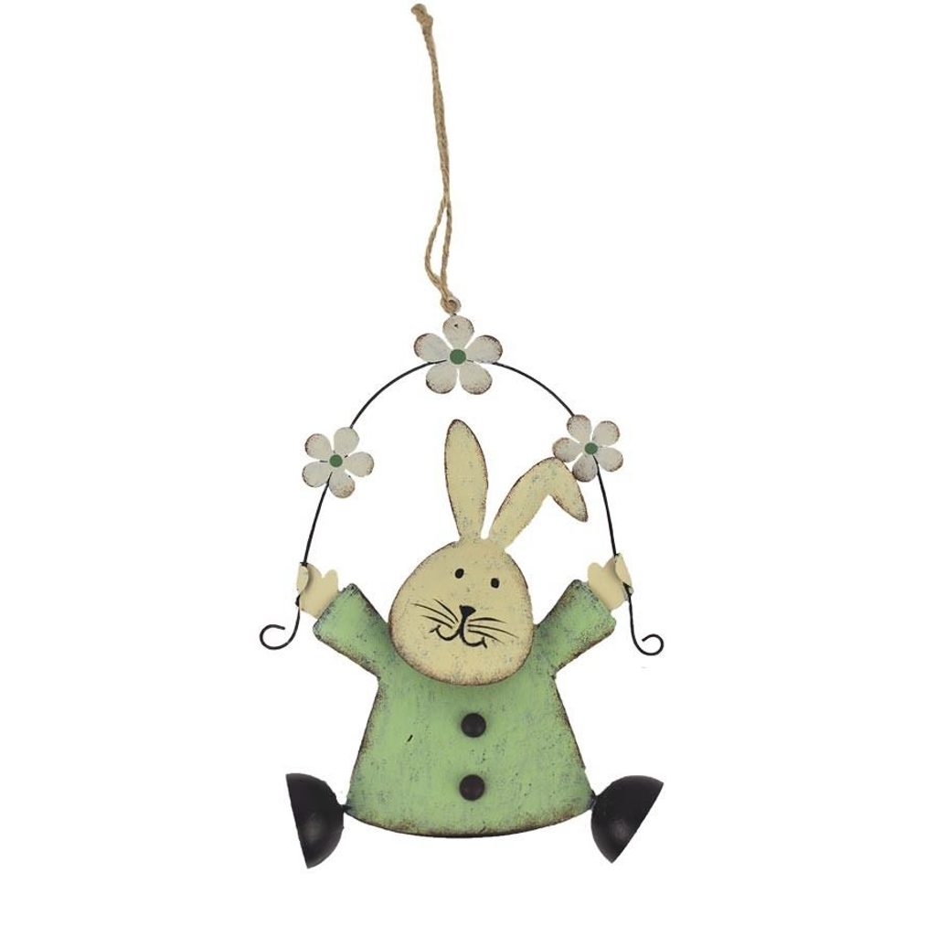 Dekorační zajíc k zavěšení. Rozměry : 13 x 3 cm, výška 19 cm. Barva : kombinace zelená s krémovou. Materiál : kov.
