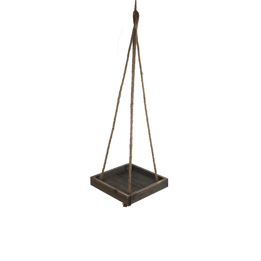 Závěs na květiny. Rozměry : 18 x 18 cm, výška 4 cm, celková délka se závěsem 65 cm. Barva : šedá. Materiál na bázi dřeva, provázek.