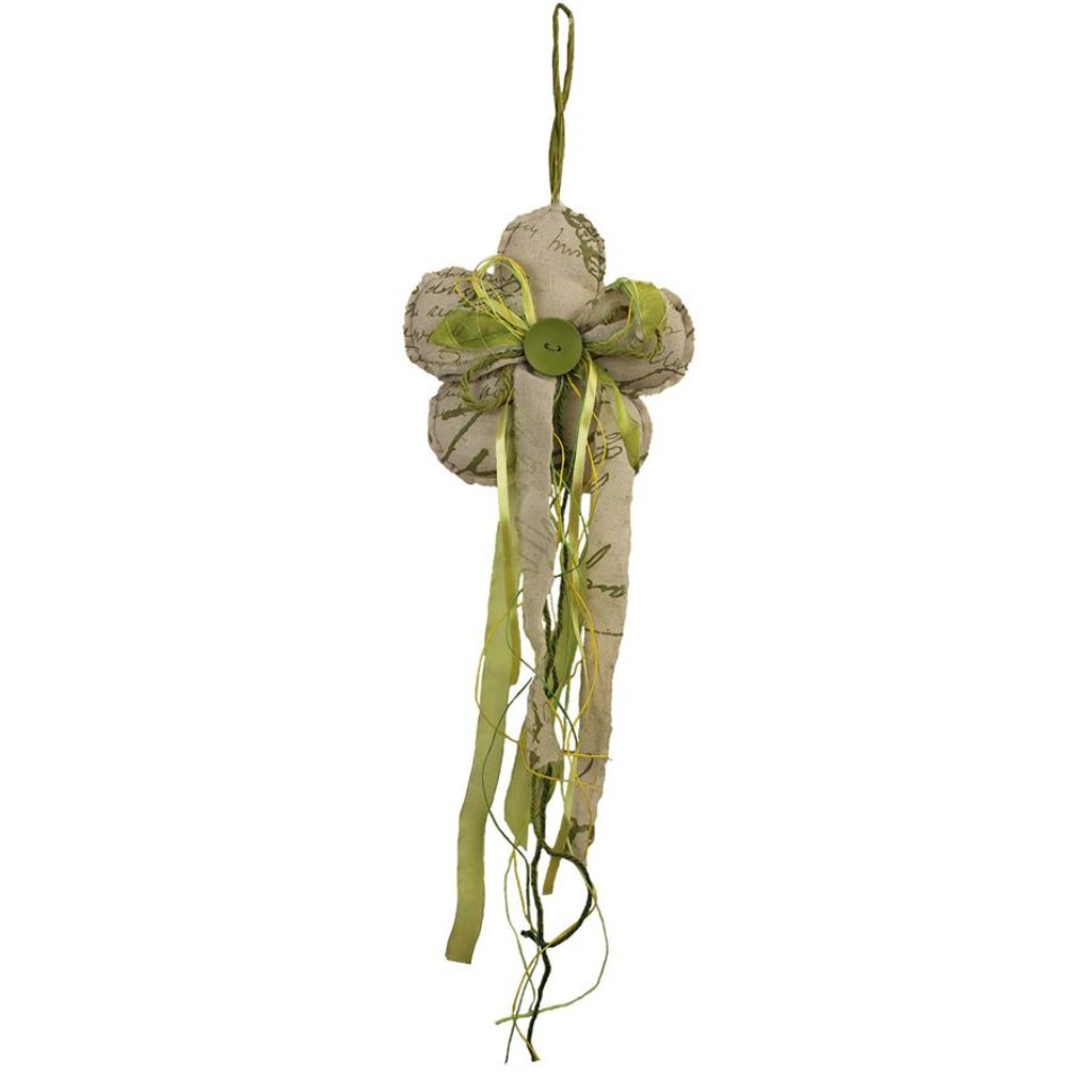 Květina k zavěšení látková. Květina má průměr 22 cm, tloušťku 5 cm, výška dekorace 50 cm. Barva : zelená. Materiál : látka.