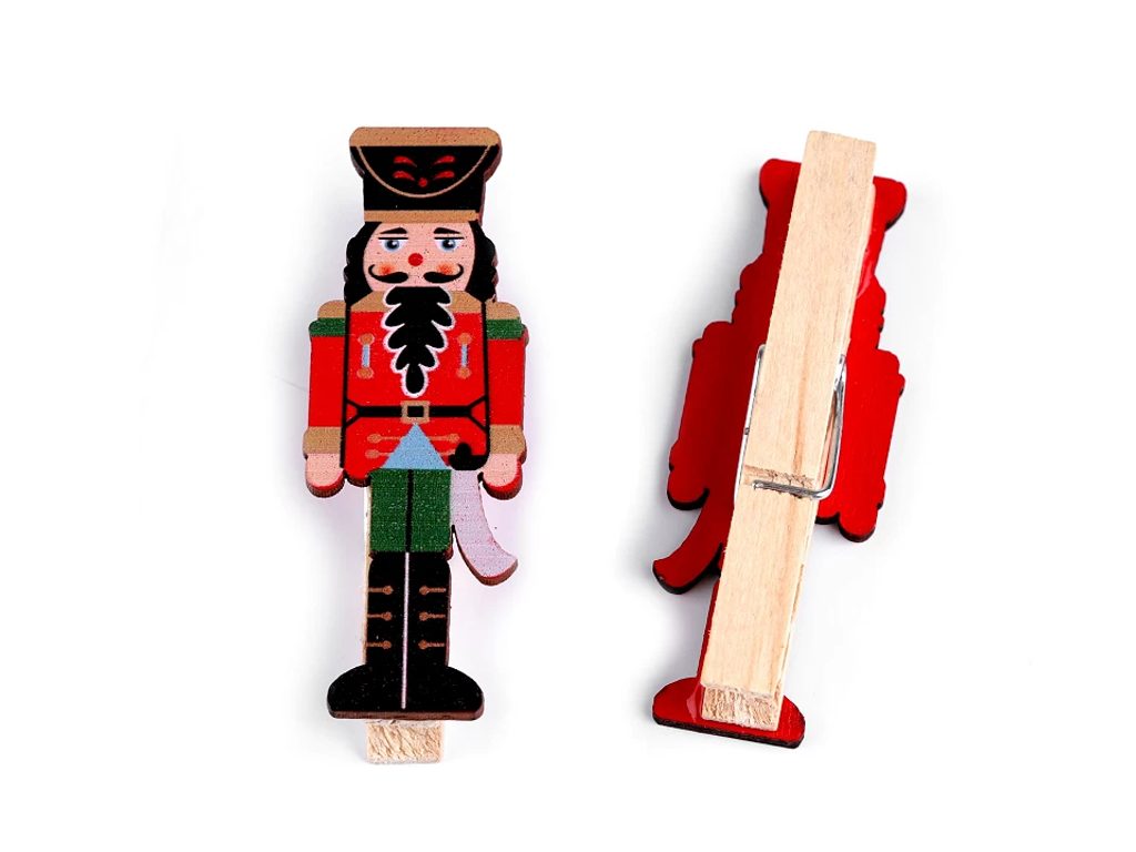 Dřevěné kolíčky zdobí postavičky Louskáčka. Stylově ozdobí vánoční dárky, pytlíky, tašky nebo květináče a vázičky.