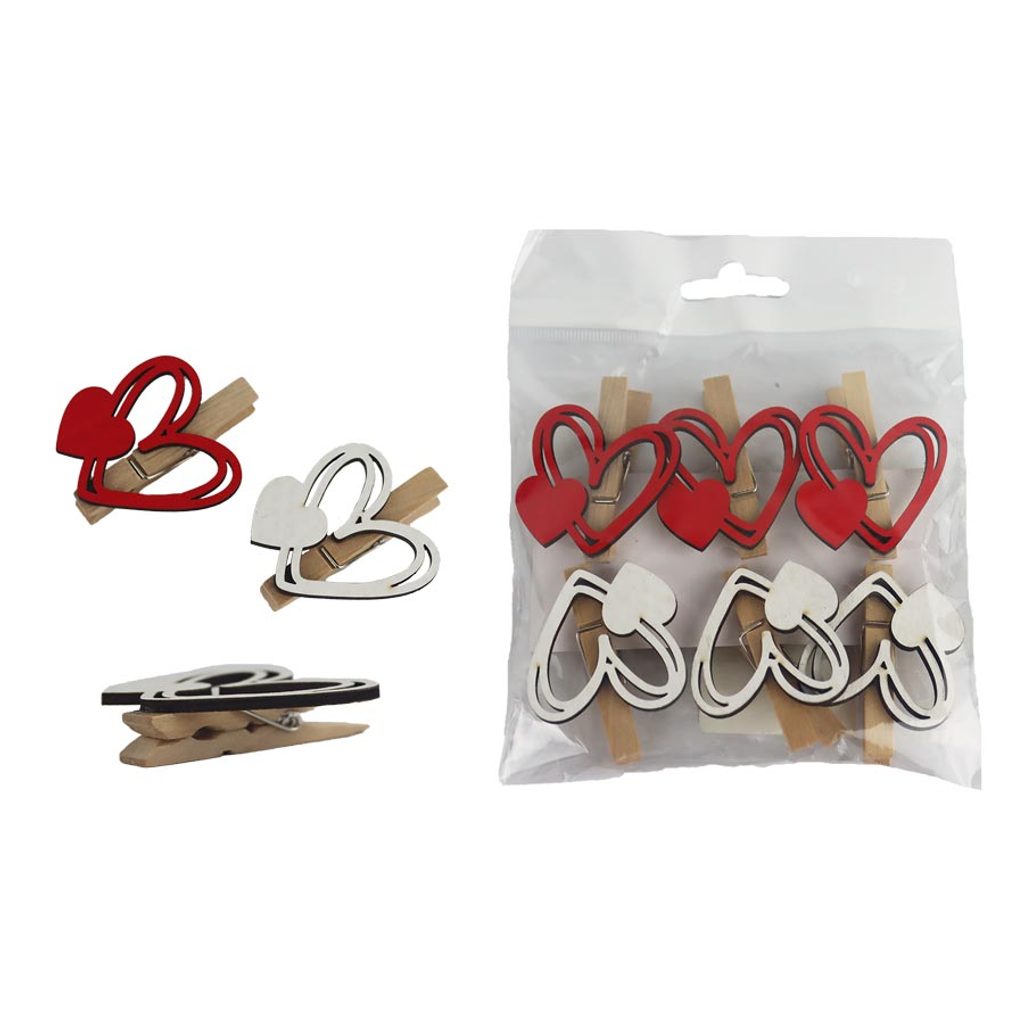 Sada dekoračních klipů. Sada obsahuje 6 klipů. Rozměry : 4,5 x 4 cm, tloušťka 1,5 cm. Barva : kombinace červená, bílá, přírodní. Materiál na bázi dřeva.