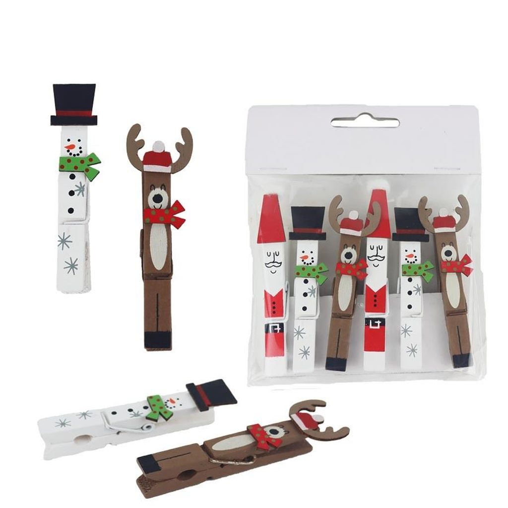 Sada vánočních klipů. Sada obsahuje 6 klipů. Rozměry : 1,4 - 2,5 cm x 8 - 9,5 cm, tloušťka 1,5 cm. Barva : kombinace bílá, hnědá, červená, černá, zelená. Materiál na bázi dřeva.
