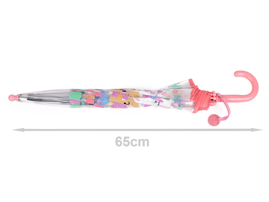 Dětský vystřelovací deštník s barevným potiskem s květy a zvířátky děti nadchne, má průhledný potah, díky kterému uvidí ven. Navíc je dost hluboký, budou mít pocit, že jsou celí schovaní. Deštník je vystřelovací, má klasickou tyč zakončenou pevnou rukojetí. Konstrukce deštníku je z pružných lamel a tvoří osm polí.