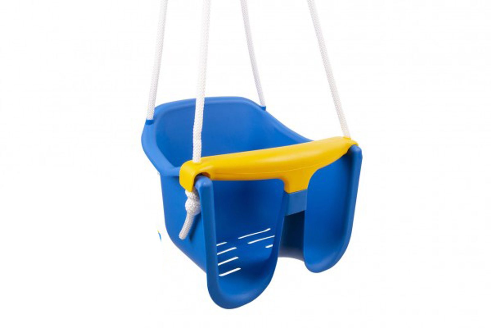 Plastová houpačka se zábranou proti vypadnutí a nastavitelnou délkou šňůr. Vzhledem ke své konstrukci a bezpečnostní pojistce je určena pro velmi malé děti, do 3 let věku. Nosnost 25kg.