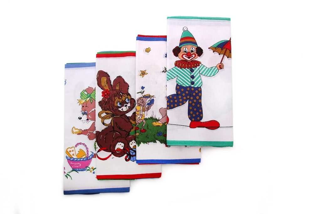 Dětské kapesníky C06. Baleno po 6 ks. Barevný tisk - dětské motivy. Dle skladových zásob.