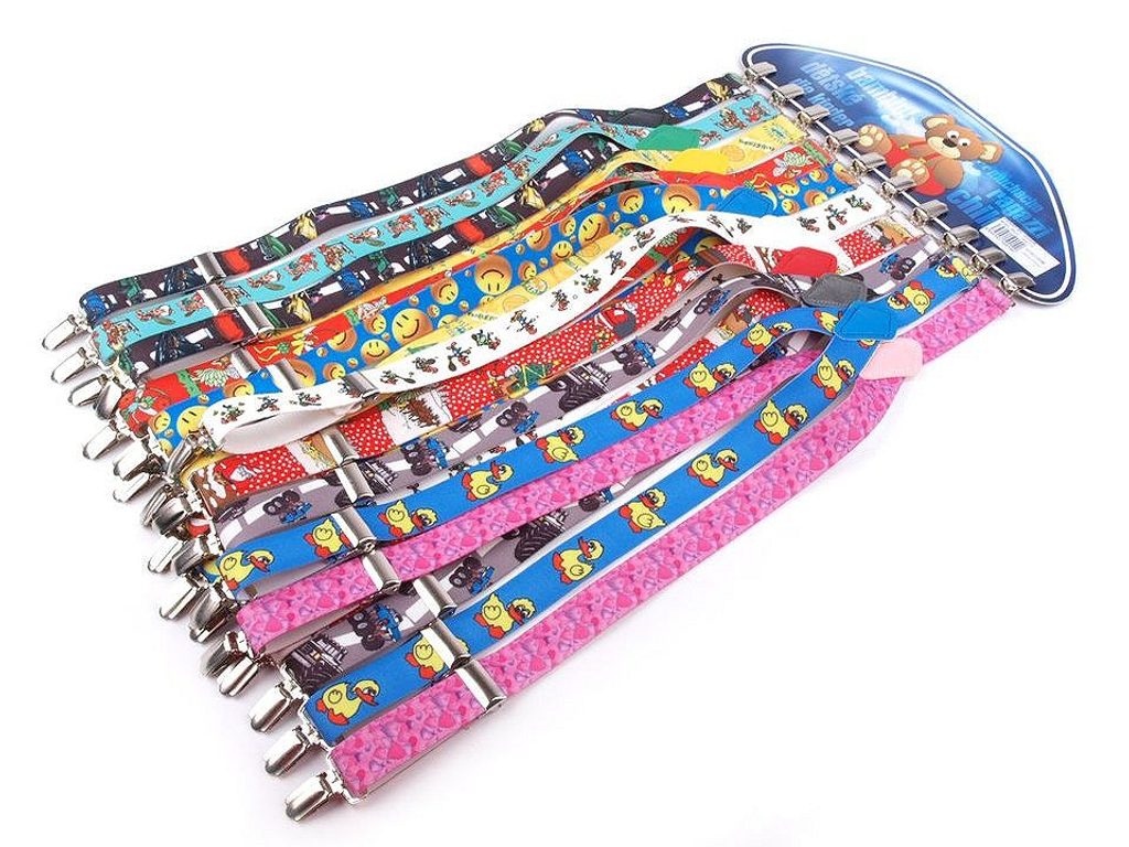 Dětské šle o délce 70 cm a šířce 2,5 cm s různými potisky, které se neodírají ani neloupou. Originální balení obsahuje 10 ks šlí v různých barvách a motivech. Jedná se o kvalitní český výrobek. Přichycují se pomocí kovových žabek, jsou vyrobené ze 100% polyesteru.