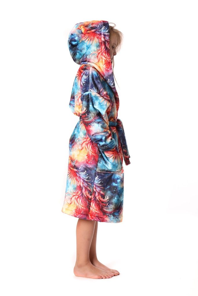 Vyrobený z jemného a velmi příjemného flannel fleece, župan Fénix je nejen hebký, ale také příjemně hřejivý. Díky technologii digitálního potisku jsou barvy vzoru jasné a zářivé, čímž dodávají županu magický vzhled. Pohodlná kapuce, velké kapsy a krásný design dělají z tohoto županu dokonalého společníka pro chladná rána a večery plné fantazie a objevování.