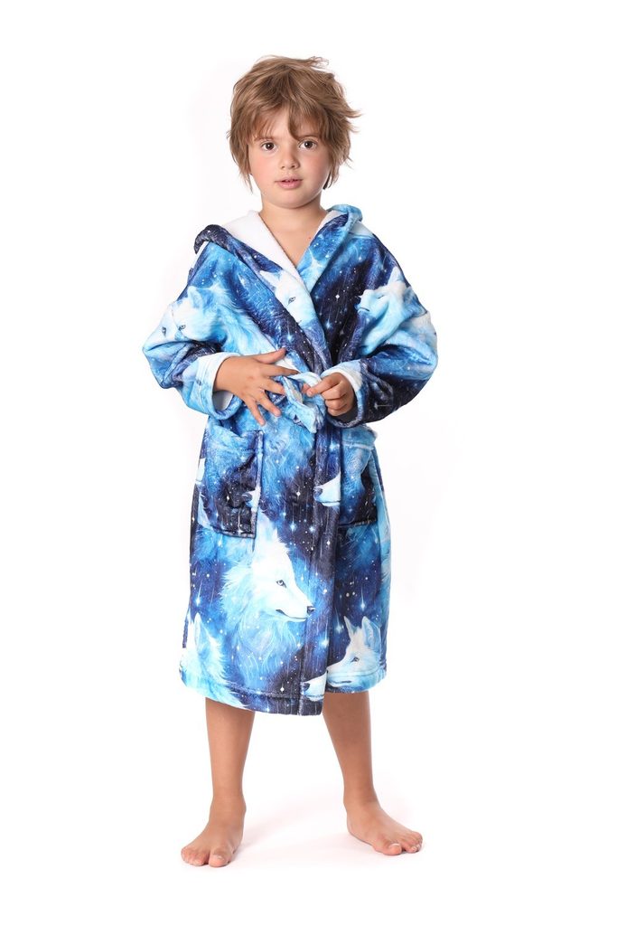 Milovníci tajemného dobrodružství, zbystřete! Přichází župan Lupo, nádherný župánek s motivem sněžných vlků, kteří čekají na malé průzkumníky, aby se k nim připojili na večerní výpravu. Tento župan je ideální volbou pro všechny děti, které sní o tichých nocích v horách, kde vlci šeptají svá dávná tajemství.