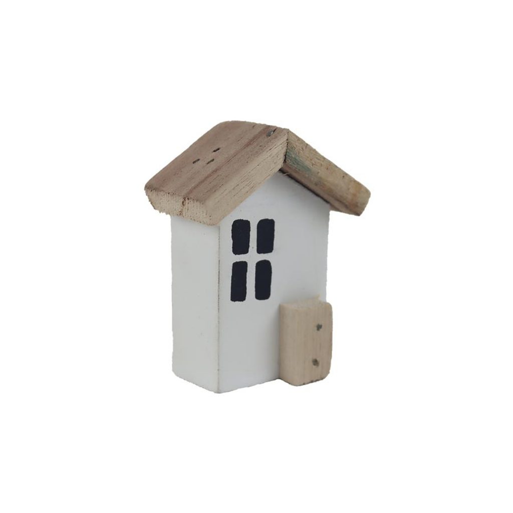 Dekorační domeček. Rozměry : 6 × 2,5 cm, výška 7 cm. Barva : kombinace bílá s přírodní. Materiál na bázi dřeva.