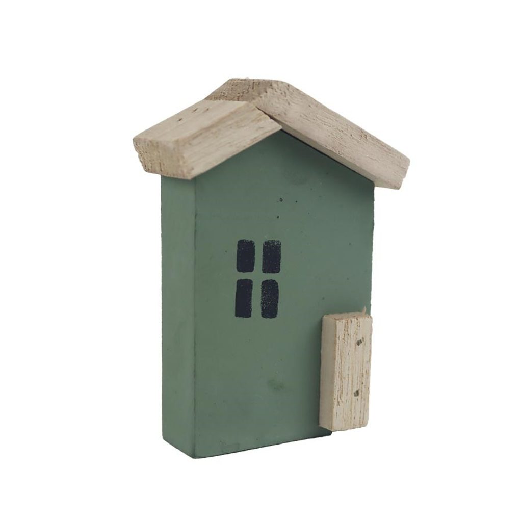 Dekorační domeček. Rozměry : 7,5 × 2,5 cm, výška 10,5 cm. Barva : kombinace zelená s přírodní. Materiál na bázi dřeva.
