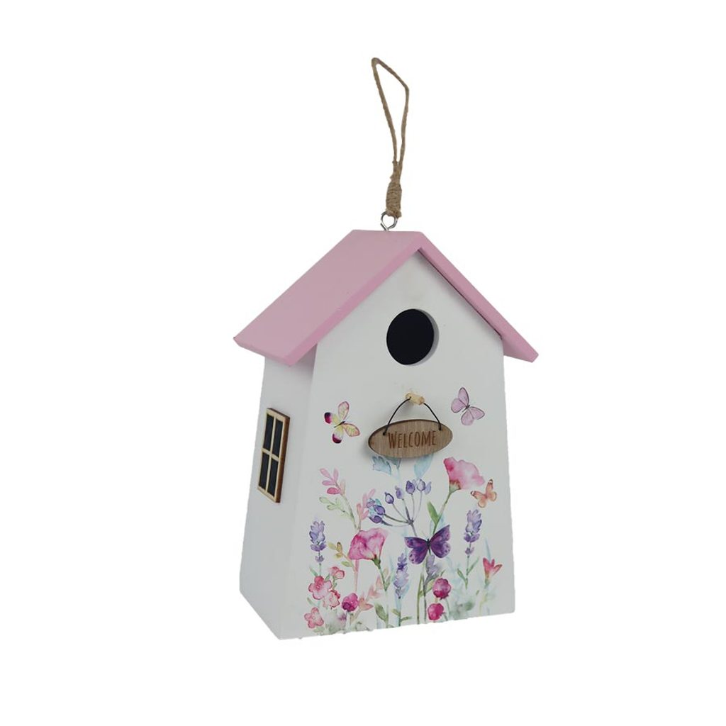 Dekorační domeček k zavěšení. Rozměry : 12 × 8 cm, výška 18 cm. Barva : kombinace růžová, bílá. Materiál na bázi dřeva.