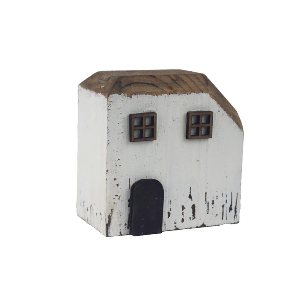 Dekorační domeček z náplavového dřeva. Rozměry : 8,4 × 5,2 cm, výška 8,7 cm. Barva : kombinace bílá, hnědá. Materiál : naplavené dřevo.