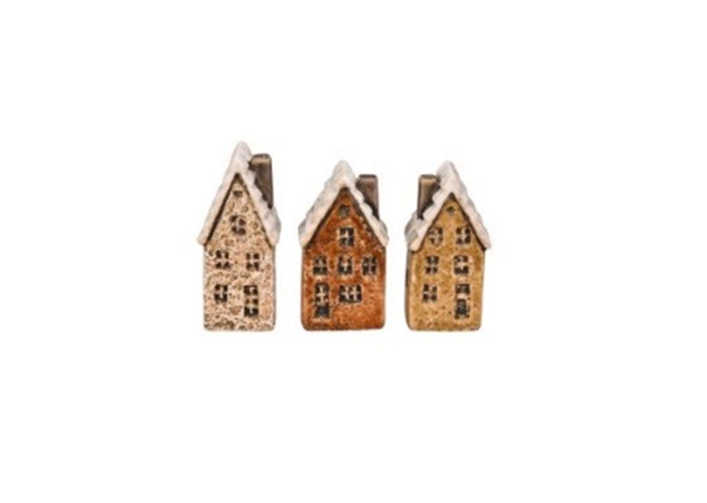 Sada dekoračních domečků. Sada obsahuje 3 domečky. Rozměry : 3 - 3,5 x 2,5 cm, výška 6 - 7 cm. Barva : hnědá. Materiál : keramika.